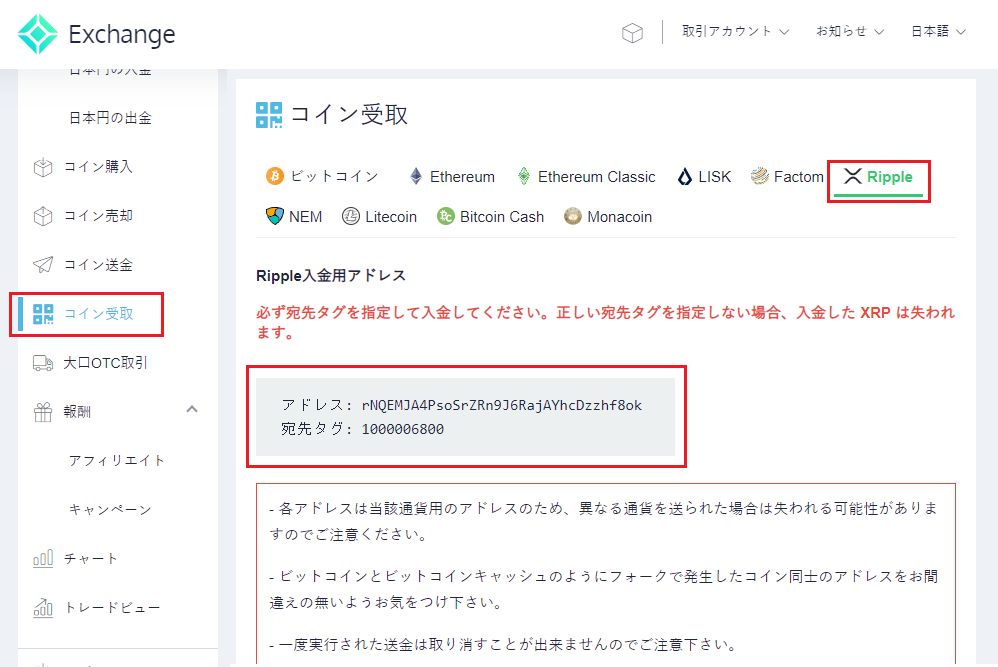 こちらはコインチェックのリップル送金先アドレスと宛先タグ情報です。