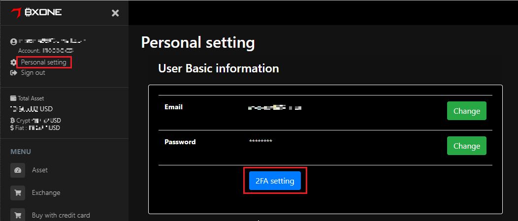 BXONE - Personal Settingページを開き、「2FA Setting」をクリックします。