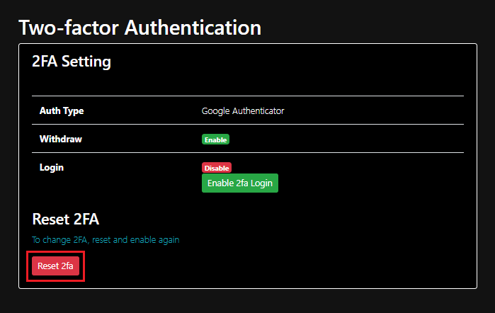 赤いボタンの「Reset 2fa」をクリックします。