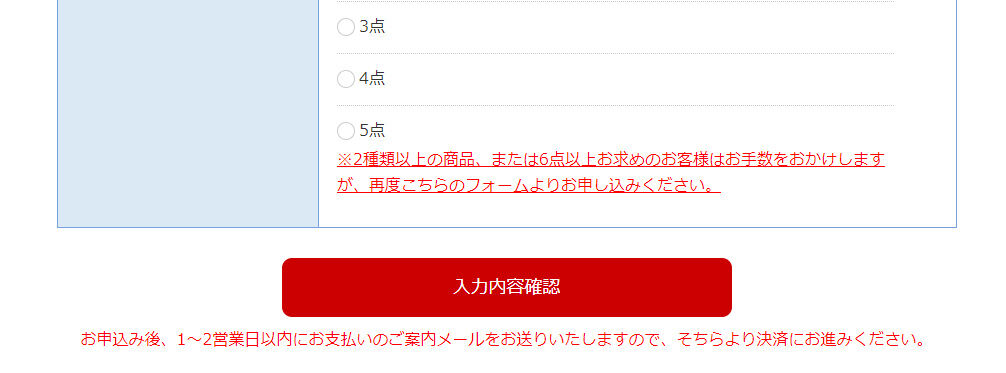 購入する商品を選択し「入力内容の確認」ボタンを押して確認画面に進みます
