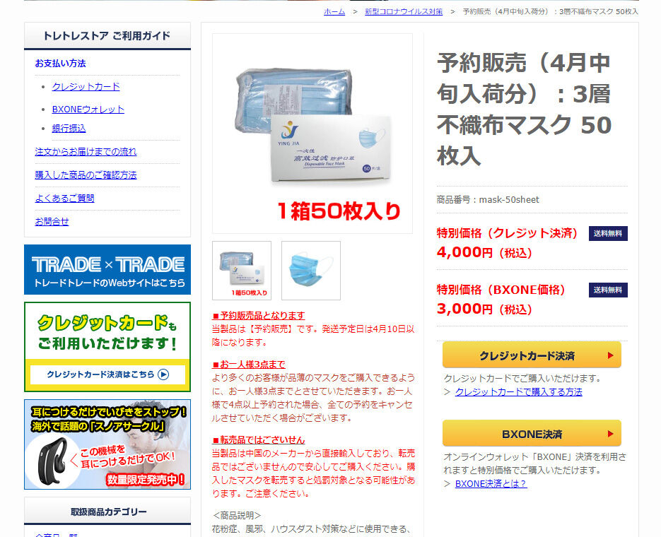 そんななか、BXONE決済が利用できる「トレトレストア」でマスクやコロナウイルス検査キット、消毒液等のコロナウィルス対策商品が購入できるようになりました。