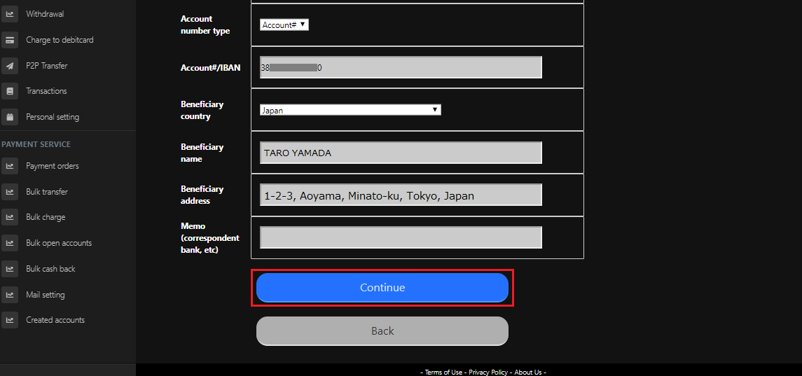 Bank account:こちらで以前に送金した銀行口座を指定することができます