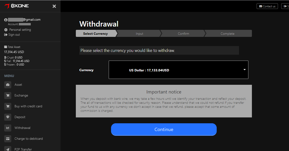 初めの項目「Amount option」は、”Input amount” を選択した場合は「Amount」に任意の出金額を入力するようになり、”Withdrawal full amount in selected currency” を選択した場合は、指定した通貨の全額を出金することができます。