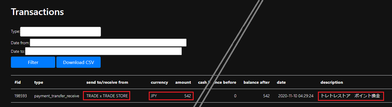 BXONEにログインし、Transactionsページを開くとポイント交換の履歴を確認できます。