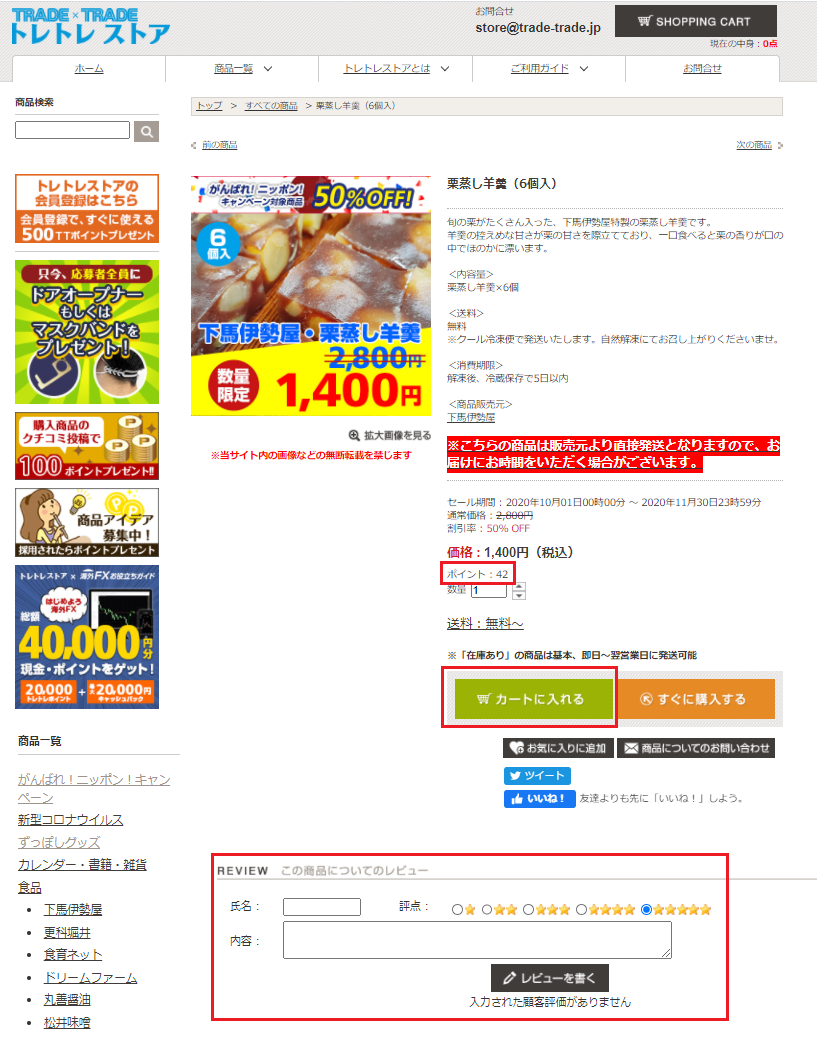 トレトレストアにログインした状態で、画像の下の方にあるレビューを書くと100ポイントが加算されます。