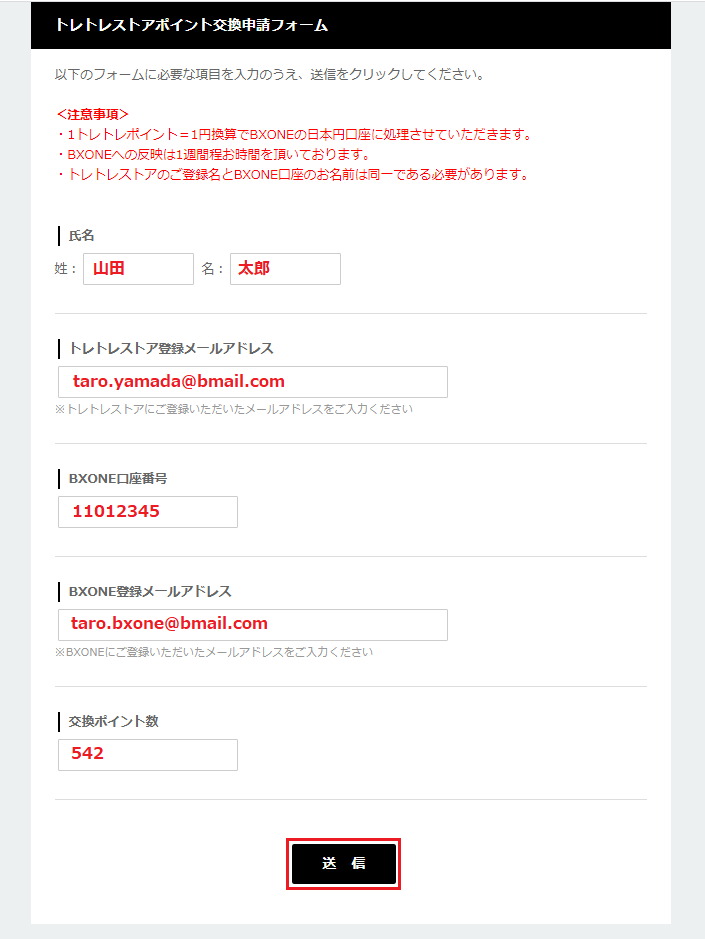 トレトレストアポイント交換申請フォームに必要情報を記入して送信しましょう。