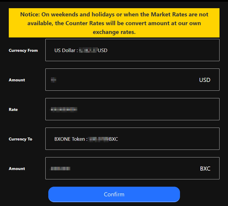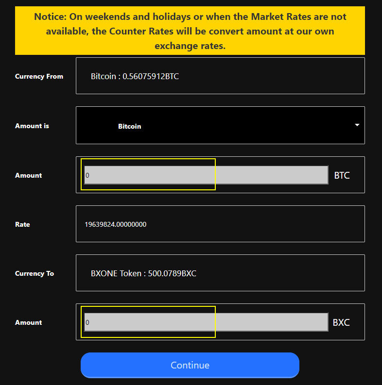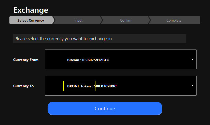 Currency ToはBXONE Tokenを選択しContinueをクリックします