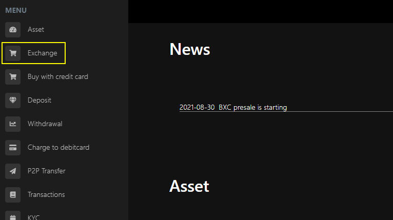 1)BXONEのユーザーページにログインし、左メニューから「Exchange」を選択します。