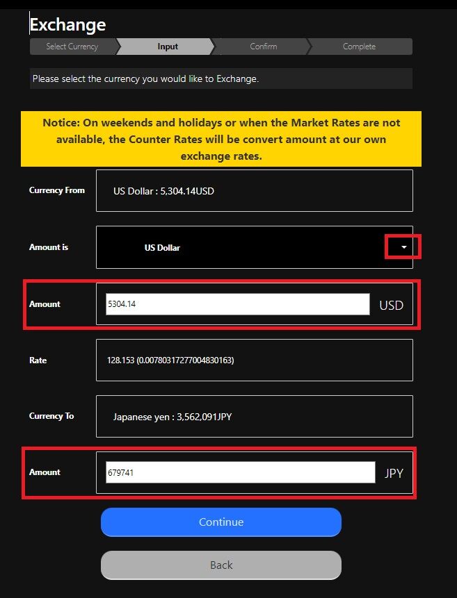- Amount/JPY : 〇円分のドルを両替したい、という場合はこちらに金額を記入