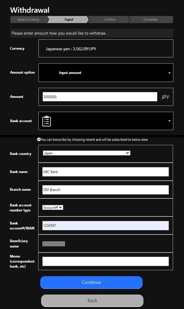 Bank account : 過去に出金した銀行口座情報をここから呼び出すことができます