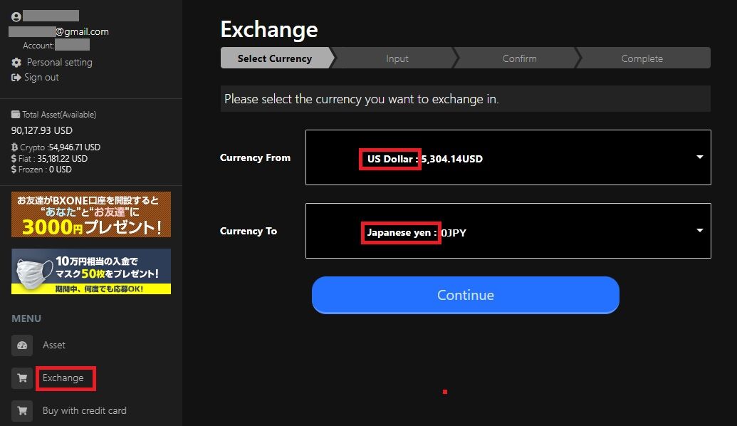 Exchangeページを開き、下記の通り通貨を指定して「Continue」をクリックします。