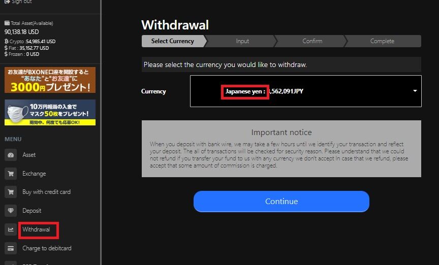 Withdrawalページを開き、Japanese yen を指定して「Continue」をクリックします。