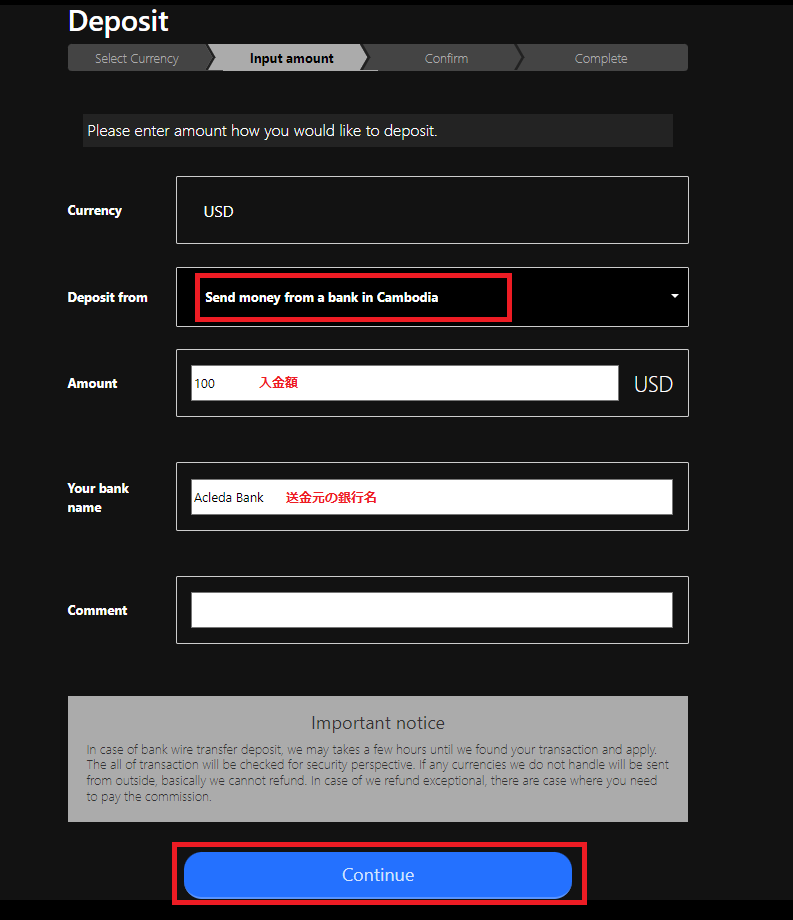 - Deposit from:"Send money from a bank in Cambodia" を指定