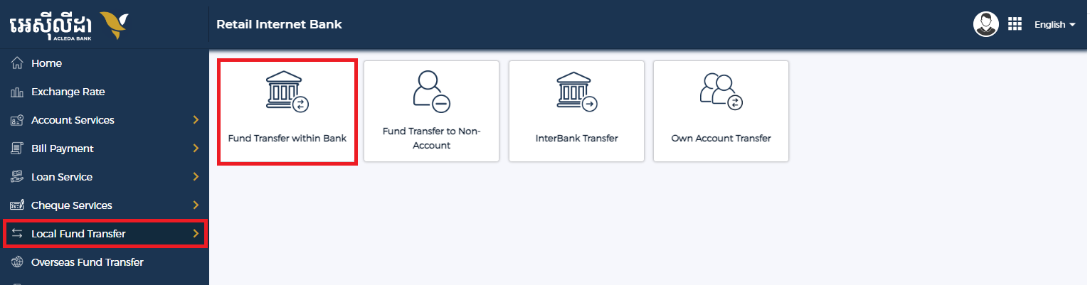 アクレダ銀行のネットバンキングにログインしたら、Local Fund Transfer を開き、Fund Transfer within bank をクリックします。