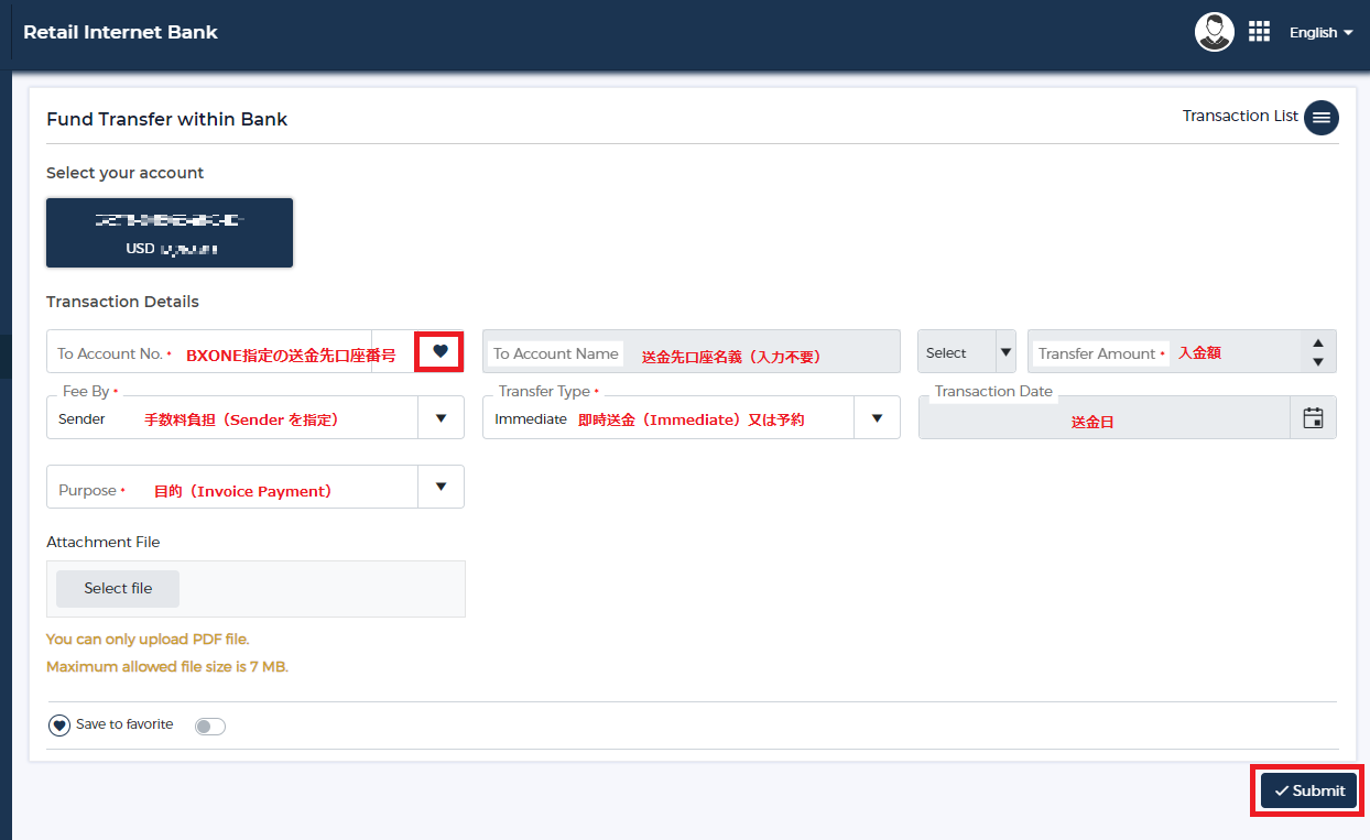 - To Account No. : BXONE指定の振込先アクレダ銀行口座番号