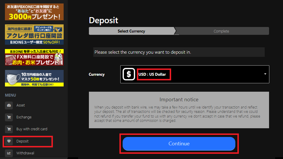 Deposit のページを開き、Currency は USD を指定して、Continue をクリックします。