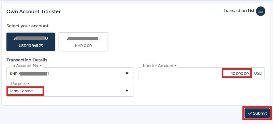 Deposit Amount:金額を入力 ※ 最低額は400,000 KHR(USD口座は100)