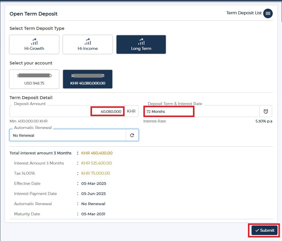 40,080,000 KHR 預けて、Long Term の 72ヵ月(6年)を指定した場合、3カ月毎に 460,400 KHR が KHR預金口座へ支払われます。