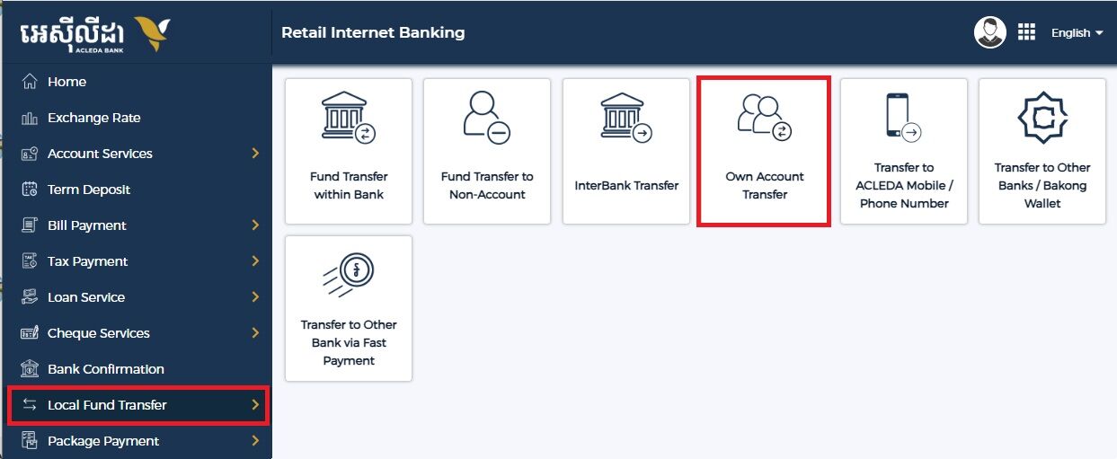 左メニューの「Local Fund Transfer」を開き、「Own Account Transfer」をクリックします。