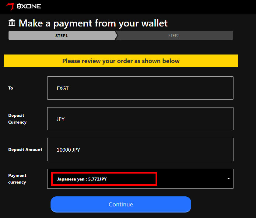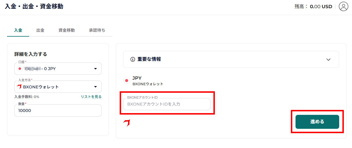 金額を確認し、BXONEのどの口座の資金を使って入金するか選択します。