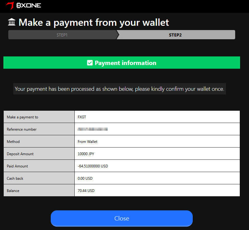 銀行送金やクレジット、GooglePayなどいろいろな入金に対応しています、FXGTですが、BXONEの入金出金に対応したことで、より簡単に即入金が反映されるようになりました。