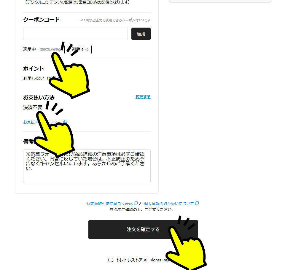 クーポンが適用されるとクーポンコードは「適用中」と表示され、お支払方法が「決済不要」となります。これで料金はかかりませんので、「注文を確定する」を選択します。
