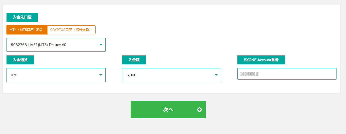 入金画面が開きますので入金通貨、入金額額、BXONE口座番号を入力し「次へ」を選択。