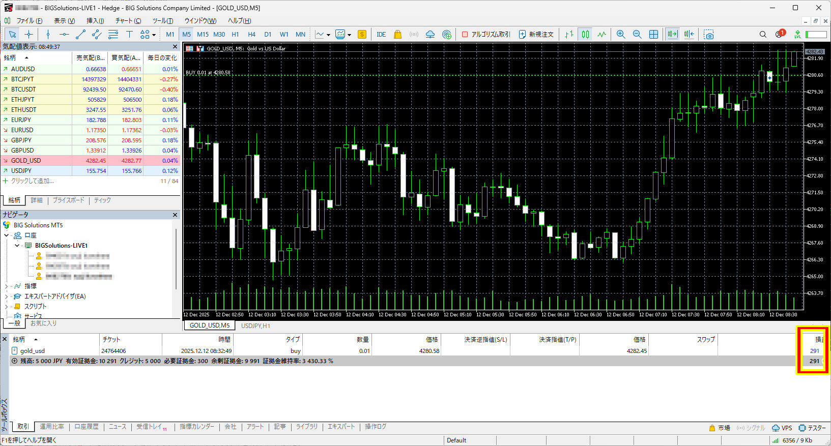 数分後、利益を見て見ると「+291円」になってました