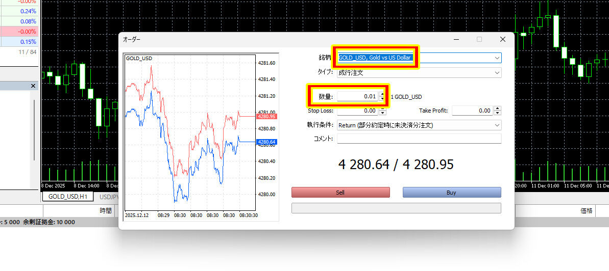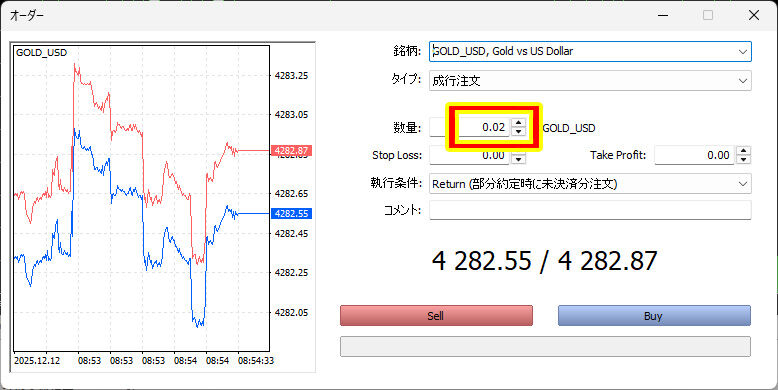 銘柄が「GOLD_USD」になっているのを確認し、数量を入れます。