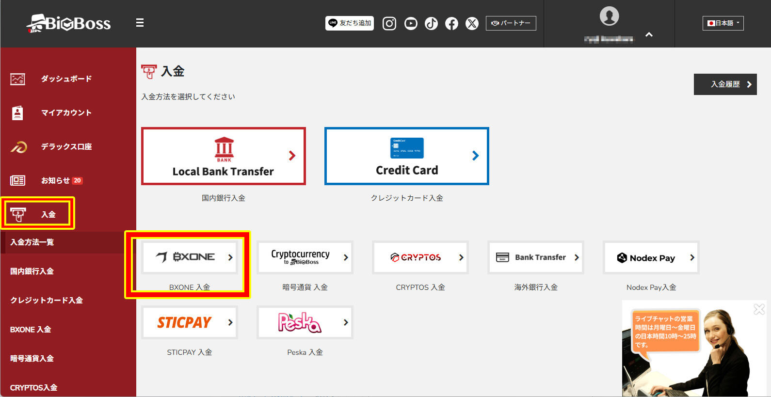 BigBossにログインし、「入金」から「BXONE」を選択します。