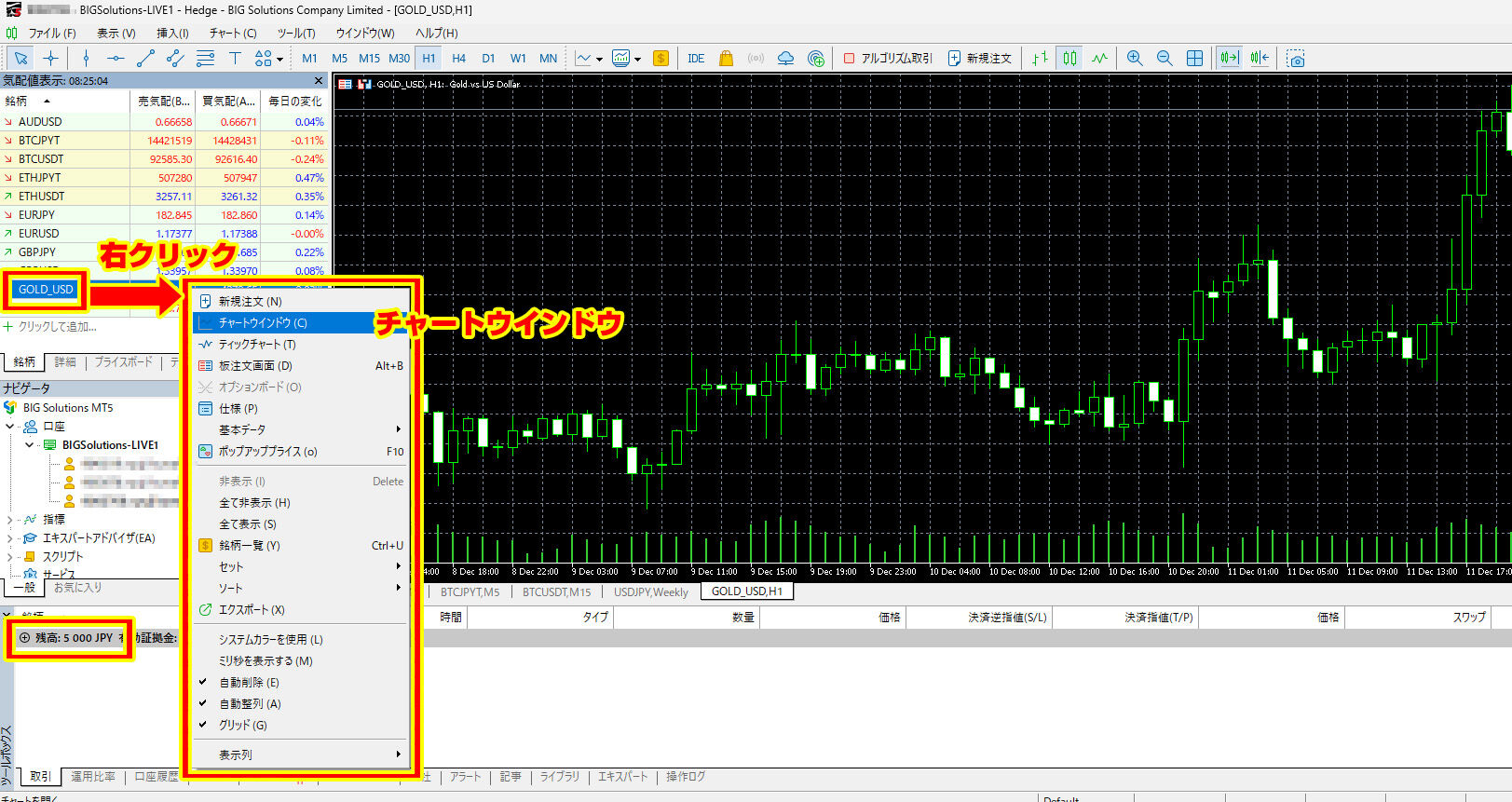 銘柄より「GOLD_USD」を右クリックし、「チャートウィンドウ」を表示させます。
