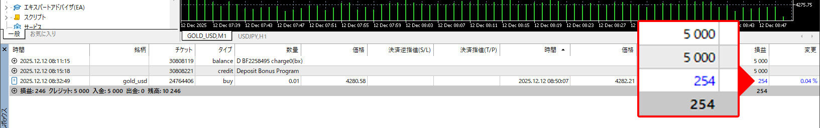 入金が完了したので、さっそく金を取引をしてみます。