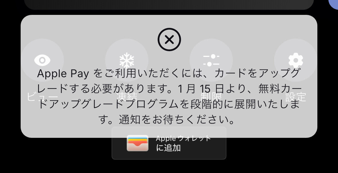 こちらですが、1月15日よりカードをアップグレードすることでApplePayの利用可能になるそうです。