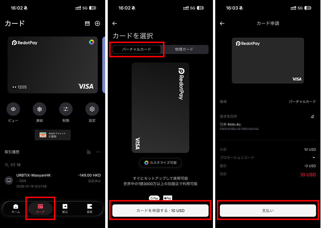 1)RedotPayアプリを開いて、メニューよりカードを選択します